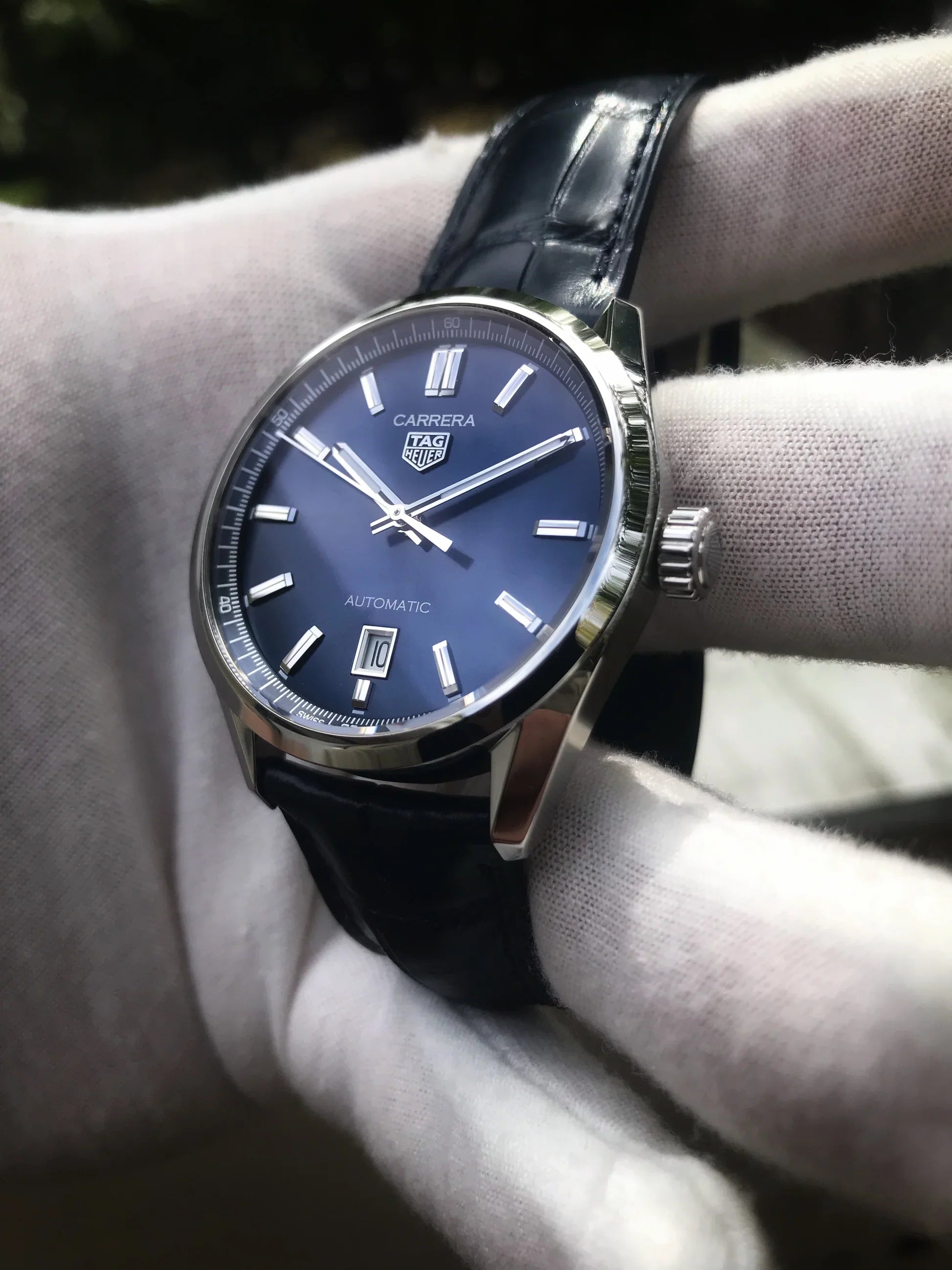 This Tag Heuer Carrera watch is made of stainless steel. The 39mm diameter case houses an automatic movement, while the blue dial features index markers. It comes on a blue leather strap with a fold over clasp. Its features include a date indicator and an exhibition caseback. Circa 2023